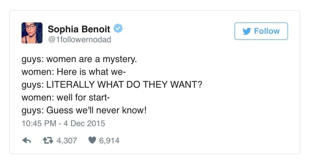 The social constructs seemingly architected against women, though, are far-reaching and frankly horrible. Yes, car manufacturers not caring if I live or die because of my gender is awful. Yes, pharmaceutical manufacturers not giving a flying fart about whether their male enhancement drug could potentially eradicate menstrual cramps because it seems sort of complicated to try is enraging. But seeing so many tiny things that so many people have to interact with daily that are disadvantageous or even discriminatory against over half the population, it’s just…it’s just…